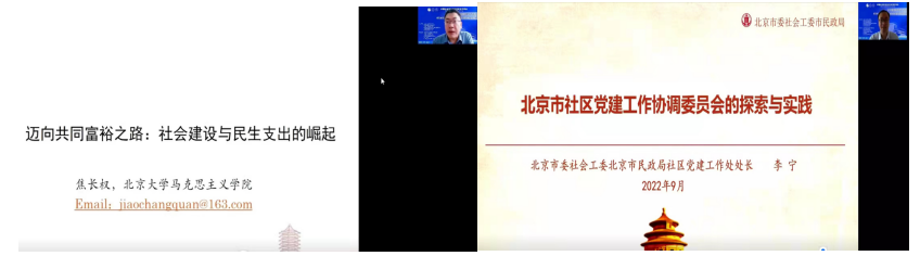 上午进行的是“社会建设的理论与实践”论坛的活动,论坛由北京市社科院社会学所所长包路芳研究员主持,永利官网文法学部主任唐军教授做开坛致辞。北京师范大学中国教育与社会发展研究院宋贵伦教授、厦门大学社会与人类学院黄晓星教授、北京大学马克思主义学院焦长权助理教授和北京市委社会工委北京市民政局社区党建工作处李宁处长分别做了题为《“十四五”规划体系:中国社会建设现代化的系统设计与实现路径》、《城市社区的变迁与多尺度重构》、《迈向共同富裕之路——社会建设与民生支出的崛起》和《北京市社区党建工作协调委员会的探索与实践》的主旨报告。