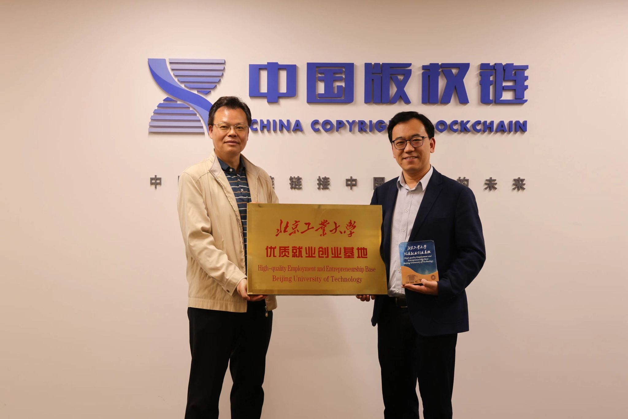 法律系主任谭柏平(左)与中国版权链总经理刘政操(右)